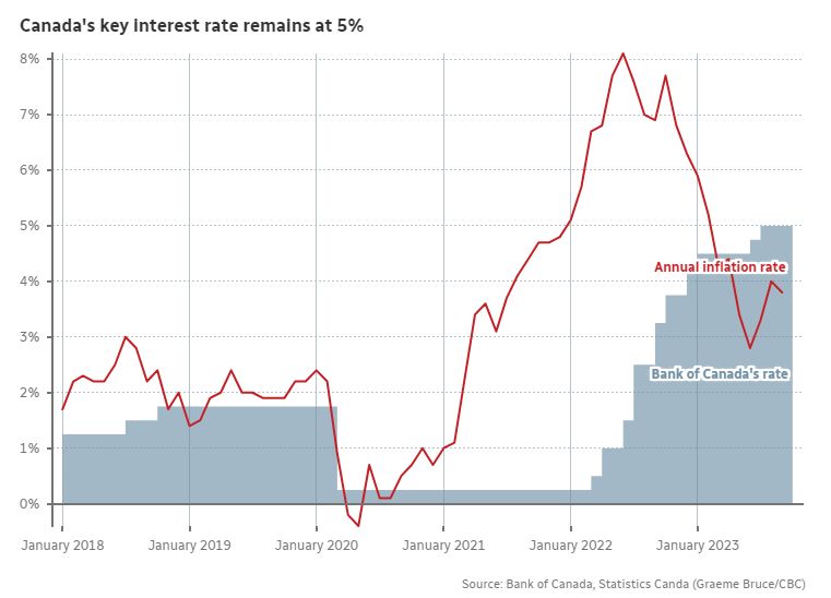 The Bank of Canada has decided to keep its benchmark interest rate steady at five per cent, the second straight time the central bank has done so and a sign it may be moving to the sidelines after raising the cost of borrowing 10 times since last year.