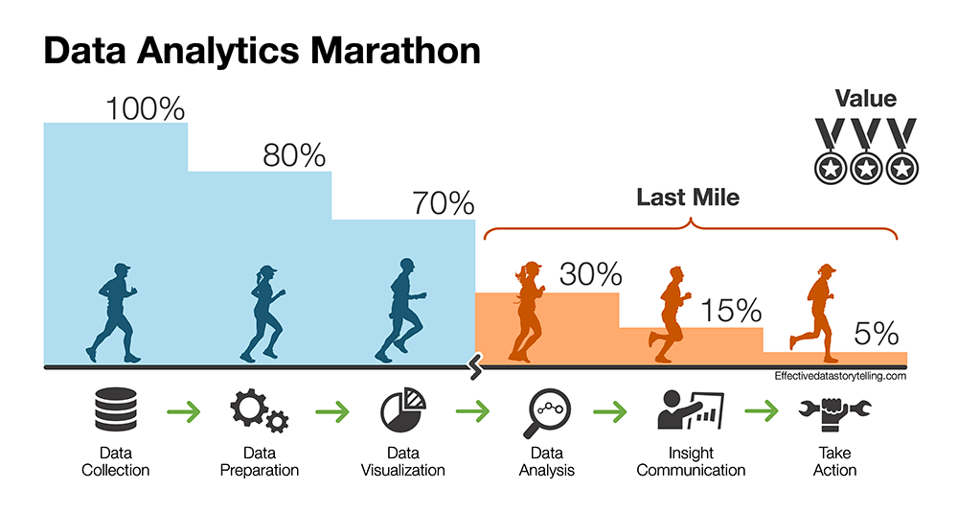 Brent Dykes in the article Data analytics marathon has very nicely drawn the parallels of data analysis journey and running the marathon and why the last step is the most critical one.
